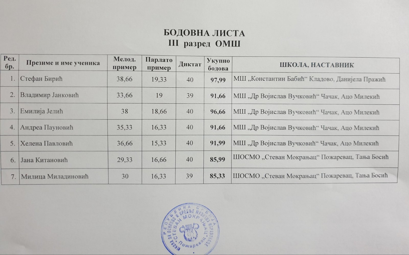 - Vera Matejević, 3. razred - (93,66 poena), klasa Jesenka Jovetić