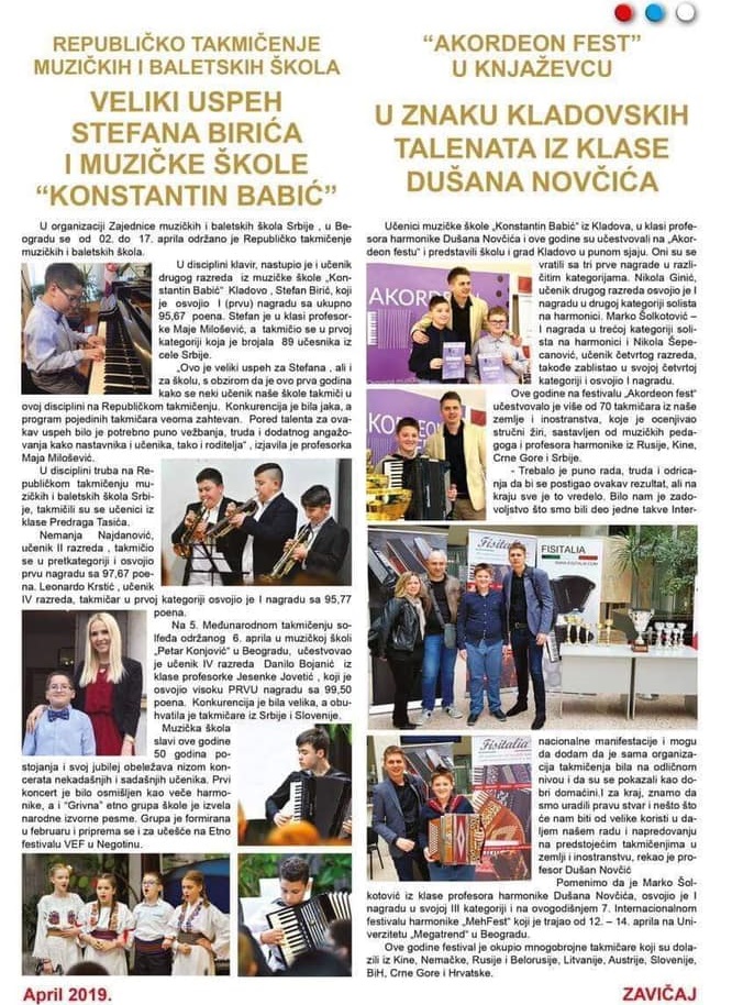 Učenici naše škole iz klase harmonike profesora Dušana Novčića, Jovan Tomić (V razred) i Filip Matić (VI razred) uzeli su učešće na ovom takmičenju i osvojili I nagrade u svojim kategorijama.