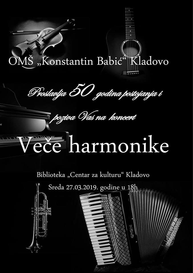 Biblioteka "Centar za kulturu" Kladovo 27.03.2019. god., povodom 50 godina postojanja OMŠ "Konstantin Babić", održan je koncert učenika iz klase profesora Dušana Novčića pod nazivom "Veče harmonike" sa gostima iz UŠ "Stevan Mokranjac" iz Negotina.